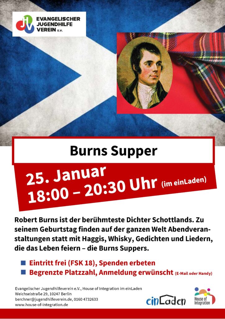 Fàilte chridheil – heißt auf Schottisch-Gälisch so viel wie “Herzlich willkommen”… und genau das seid ihr beim legendären “Burns Supper” am 25. Januar von 18 bis 20:30 Uhr im einLaden unseres “House of Integration”. Für alle, die damit nichts anfangen können: Robert Burns ist der berühmteste Dichter Schottlands. Zu seinem Geburtstag finden auf der ganzen Welt Abendveranstaltungen statt mit Haggis, Whisky, Gedichten und Liedern, die das Leben feiern – die Burns Suppers. Kommt gerne vorbei und feiert mit uns diese tolle Tradition!