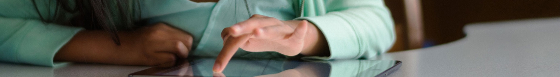 Eine Person in einem hellgrünen Langarmhemd berührt mit ihrem Zeigefinger ein Tablet auf einer weißen Oberfläche und interagiert mit diesem.