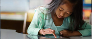 Ein junges Mädchen sitzt konzentriert an einem Tisch und bedient mit dem Finger ein Tablet. Sie trägt einen hellgrünen Kapuzenpullover und hat langes dunkles Haar. Der Hintergrund ist leicht verschwommen.