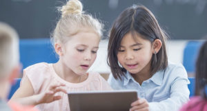 Zwei junge Mädchen sitzen zusammen in einem Klassenzimmer und schauen aufmerksam auf den Bildschirm eines Tablets. Ein Mädchen hält das Gerät, das andere zeigt darauf. Beide wirken konzentriert und aufmerksam.