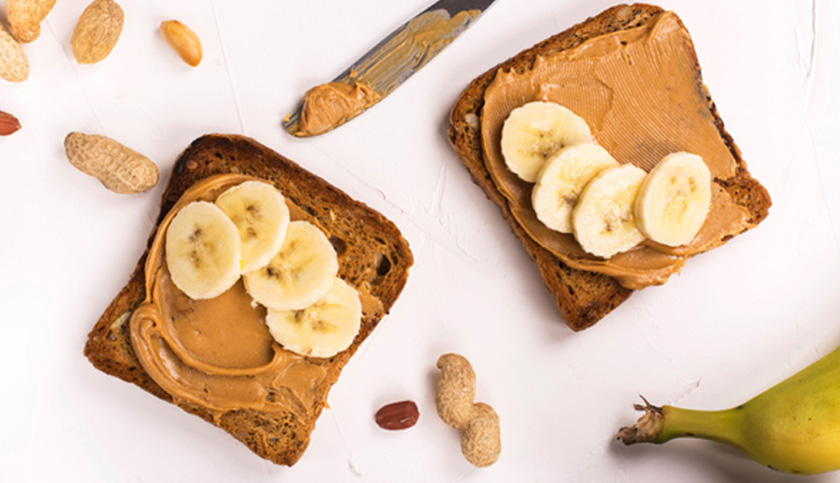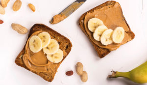 Zwei Toastscheiben mit Erdnussbutter und Bananenscheiben auf einer weißen Fläche, umgeben von Erdnüssen, einem Messer mit Erdnussbutter und einem Teil einer Banane.