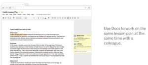 In einem Google Docs-Fenster wird ein Unterrichtsplan zum Thema Gesundheit mit hervorgehobenem Text angezeigt. Rechts sind Benutzersymbole für Mitwirkende zu sehen. Rechts steht: „Verwenden Sie Docs und Google Classroom, um gleichzeitig mit einem Kollegen am selben Unterrichtsplan zu arbeiten.“.