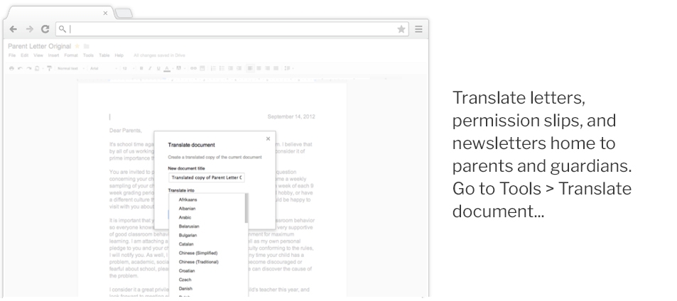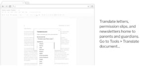 Ein Google Docs-Fenster ist geöffnet. Das Tool „Dokument übersetzen“ ist ausgewählt und zeigt ein Dropdown-Menü mit verschiedenen Sprachen. Der Text neben dem Bild erläutert hilfreiche Google Classroom-Tipps zum Übersetzen von Elternbriefen über „Tools > Dokument übersetzen“.