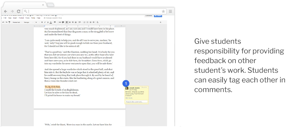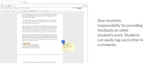 Ein Google Docs-Fenster zeigt einen Kommentar zum markierten Text und veranschaulicht, wie sich Schüler gegenseitig Feedback geben können. Der Text daneben enthält Tipps zu Google Classroom: Schüler können Klassenkameraden in Kommentaren ganz einfach markieren, um gemeinsam Feedback zu erhalten.