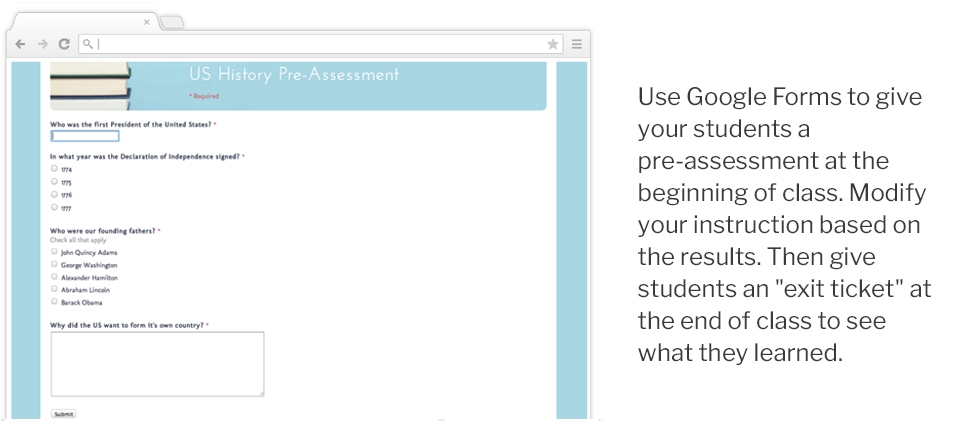 Auf einem Computerbildschirm wird ein Vorabtestquiz zur US-Geschichte mit Multiple-Choice-Fragen angezeigt. Der Text rechts hebt die Verwendung von Google Classroom hervor und empfiehlt Google Forms für die Vorabprüfung und Exit-Tickets zur Unterstützung des Unterrichts.