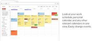 Ein Computerbildschirm zeigt einen digitalen Kalender mit verschiedenfarbigen Terminen. Der Text daneben lautet: „Google Classroom-Termine ganz einfach verwalten – sehen Sie Ihre beruflichen, privaten und schulischen Kalender auf einen Blick. Aktualisieren Sie Termine mühelos.“.