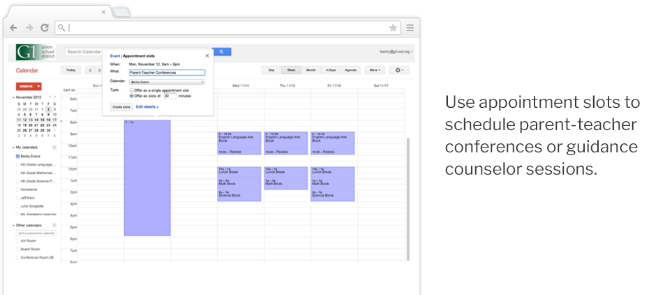 Auf einem Computerbildschirm wird ein digitaler Kalender mit mehreren blauen Terminfenstern angezeigt. Rechts steht: „Nutzen Sie Terminfenster – eine von vielen Möglichkeiten, Google Classroom zu nutzen – für die Planung von Elternsprechtagen oder Beratungsgesprächen.“.