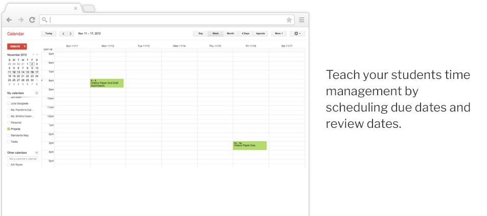 Screenshot eines Online-Kalenders mit Aufgaben, die für bestimmte Termine geplant sind. Daneben steht der Text: „Bringen Sie Ihren Schülern Zeitmanagement bei, indem Sie Abgabe- und Überprüfungstermine festlegen – eine der vielen hilfreichen Möglichkeiten, Google Classroom zu nutzen.“.
