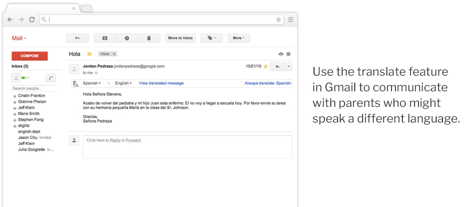 Screenshot eines Gmail-Posteingangs mit einer geöffneten E-Mail, in dem die Funktion „Nachrichten übersetzen“ hervorgehoben ist, zusammen mit einem Text, der ihre Verwendung vorschlägt – ein wichtiger Google Classroom-Tipp für die Kommunikation mit Eltern, die verschiedene Sprachen sprechen.