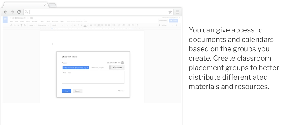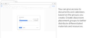Auf einem Computerbildschirm wird ein Google Docs-Freigabefenster mit einer hervorgehobenen E-Mail-Adresse angezeigt. Daneben wird in einem Text erklärt, wie Google Classroom Klassengruppen Zugriff auf Dokumente und Kalender gewährt, um Materialien und Ressourcen zu verteilen.