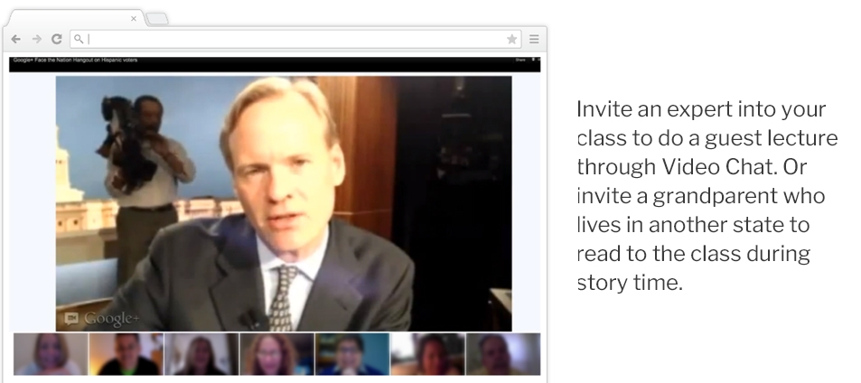 Ein Mann im Anzug spricht während eines Videochats auf einem Computerbildschirm, während ein Kameramann im Hintergrund filmt. Ein Text schlägt vor, Google Classroom zu nutzen, um Experten oder Großeltern per Videochat zum Unterricht einzuladen.