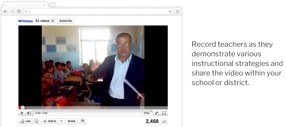 Ein angehaltenes YouTube-Video zeigt einen Lehrer vor einer Klasse mit Schülern an ihren Tischen. Der Text rechts schlägt vor, Google Classroom zu nutzen, um aufgezeichnete Unterrichtsvideos innerhalb von Schulen oder Schulbezirken zu teilen.