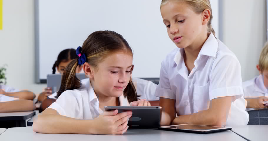 Zwei junge Mädchen in Schuluniformen sitzen an einem Schreibtisch und erkunden gemeinsam die digitale Integration auf einem Tablet, während andere Schüler im Hintergrund arbeiten. Der Klassenraum ist mit weißen Wänden und einem Whiteboard ausgestattet.