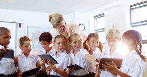 Eine Gruppe junger Schüler in Schuluniformen steht lächelnd und mit Tablets in der Hand zusammen und interagiert miteinander. Sie demonstrieren die Integration von Technologie in den Unterricht, während in einem hellen Klassenzimmer ein ebenfalls lächelnder Lehrer hinter ihnen steht.