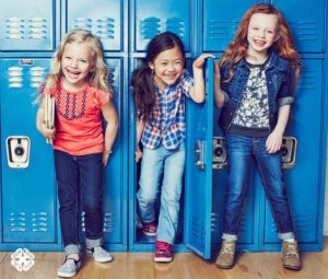 Drei junge Mädchen stehen lächelnd und lachend vor blauen Schulschließfächern. Ein Mädchen steht in einem offenen Schließfach, die anderen stehen mit Büchern in der Hand und in Freizeitkleidung daneben.