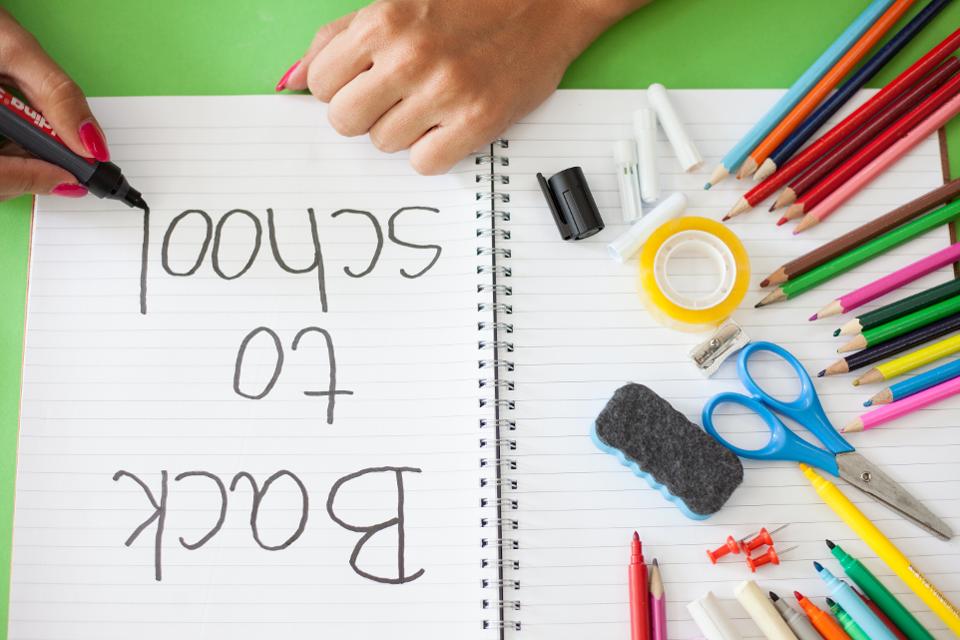 Eine Person schreibt „Zurück zur Schule“ kopfüber in ein Notizbuch, umgeben von Schulmaterialien wie Buntstiften, Markern, Klebeband, Scheren, Spitzer, Radiergummi und Büroklammern auf einer grünen Oberfläche – perfekt für die Planung von Aktivitäten nach der Schule.