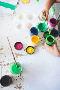 Die Hände eines Kindes halten einen grünen Farbtopf und einen Pinsel, umgeben von offenen Töpfen mit bunter Farbe auf einem weißen, leicht abgenutzten Tisch – perfekt für kreative Aktivitäten nach der Schule mit Papier und Kunstbedarf.