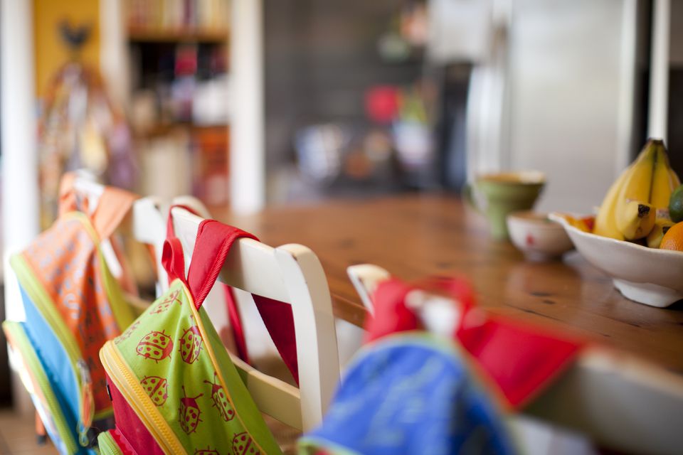 Bunte Stoffservietten hängen über den Rückenlehnen weißer Stühle um einen hölzernen Esstisch. Obstschalen und andere Gegenstände stehen auf dem Tisch, im Hintergrund ist eine verschwommene Küche zu sehen.