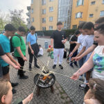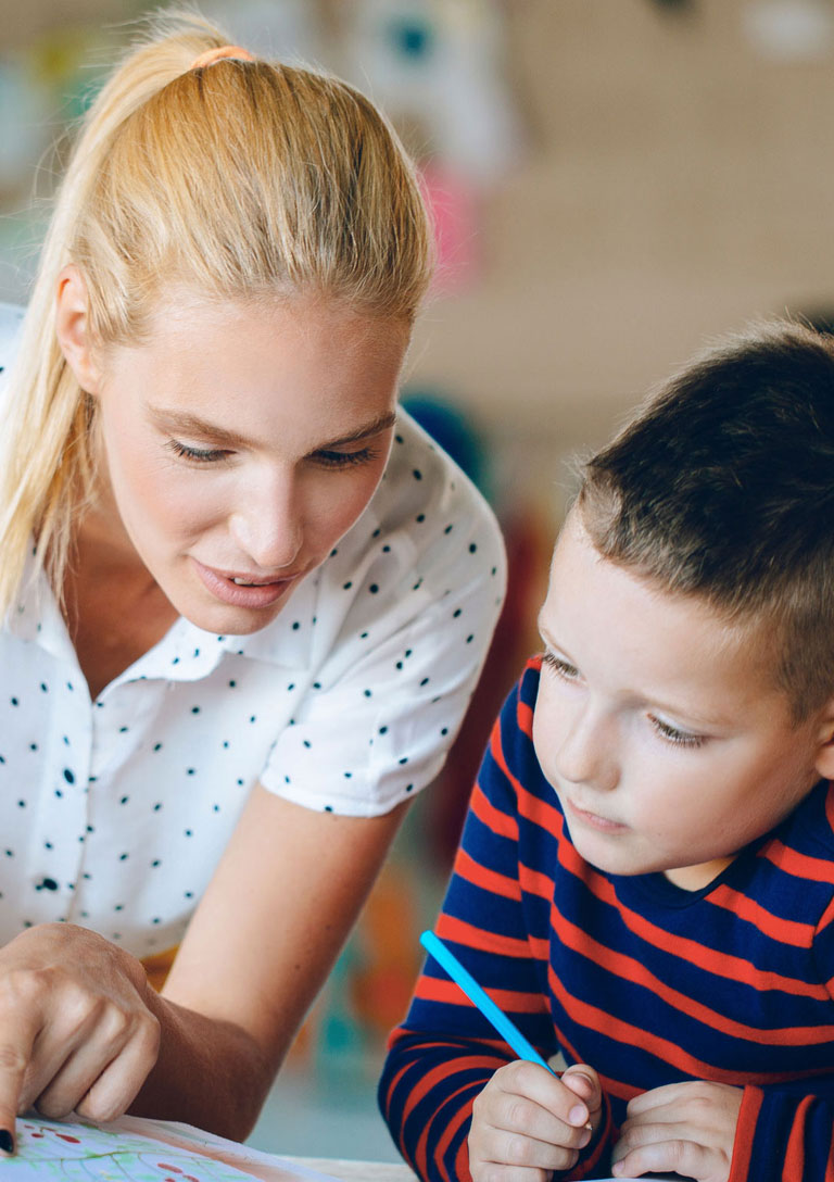 Eine blonde Frau hilft einem Jungen in einem rot-marineblau gestreiften Hemd beim Zeichnen mit einem blauen Stift. Während sie sich auf ihre Beschäftigung am Tisch konzentrieren, liegt ein Stundenplan daneben, der auf ihren geregelten Tagesablauf hindeutet.
