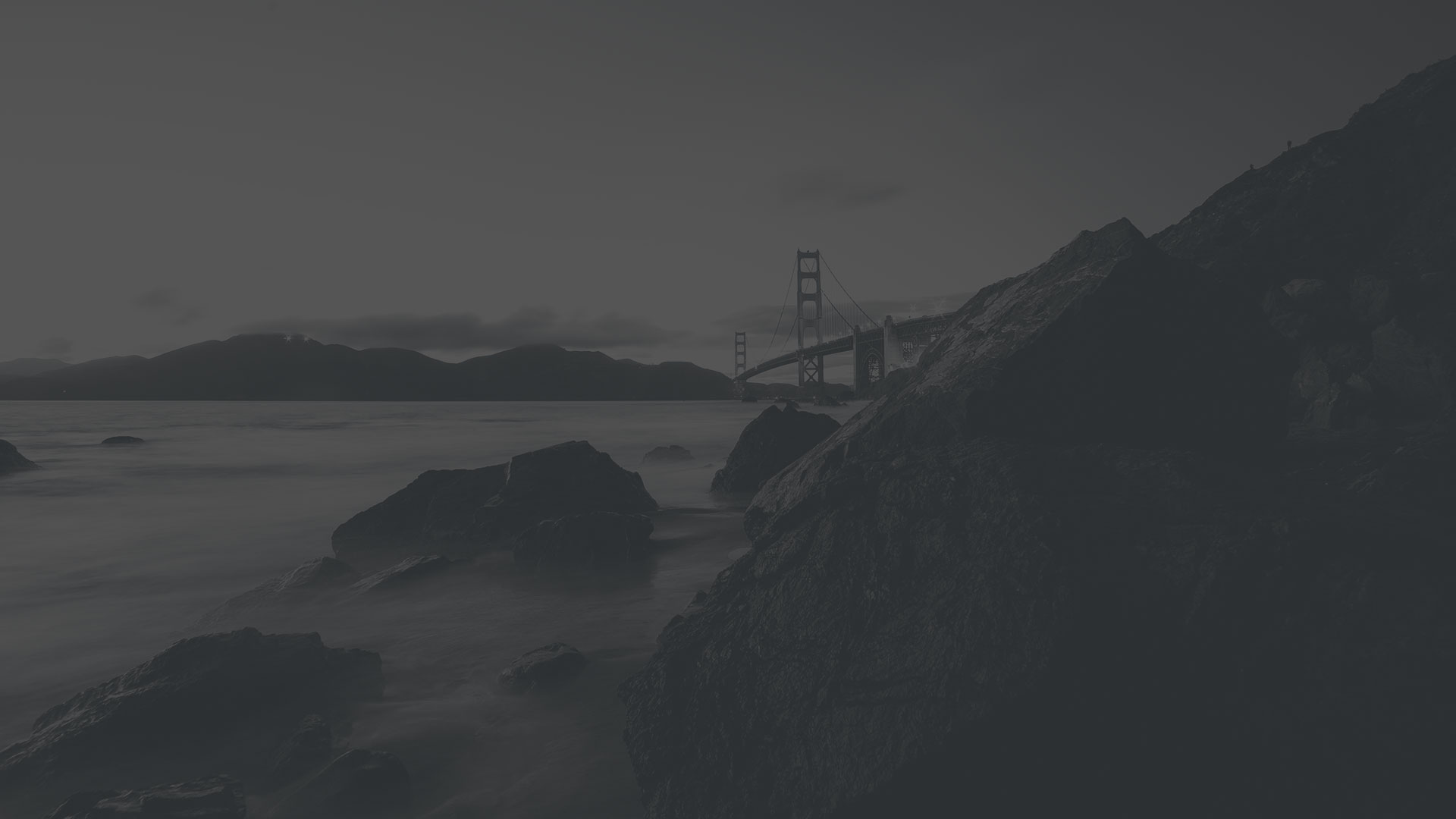 Ein stimmungsvolles, dunkel getöntes Foto der Golden Gate Bridge in San Francisco, die teilweise durch große Felsen entlang der Küste verdeckt wird, während im Hintergrund unter einem bewölkten Himmel Wasser und Hügel zu sehen sind.