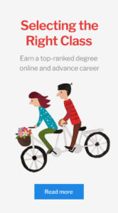 Illustration einer Frau und eines Mannes auf einem Tandem. Die Frau vorne trägt einen Blumenkorb. Der Text oben lautet: Die richtige Kurswahl. Erwerben Sie online einen erstklassigen Abschluss und fördern Sie Ihre Karriere. Blauer „Weiterlesen“-Button unten.