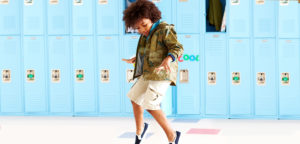 Ein kleines Kind in Tarnjacke, Shorts und Turnschuhen tanzt fröhlich vor einer Reihe hellblauer Schließfächer und schreibt mit jeder unbekümmerten Bewegung Geschichte.