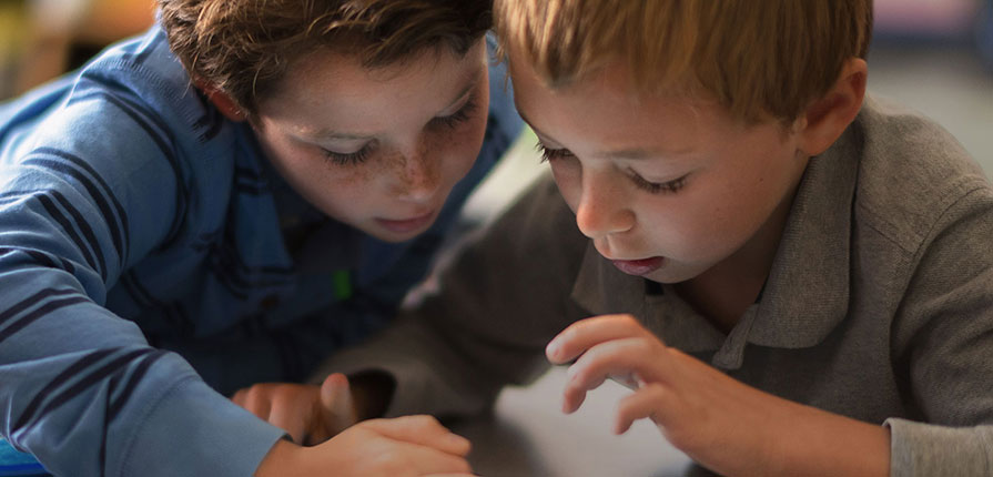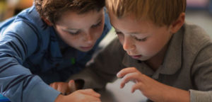 Zwei Jungen liegen auf dem Boden, betrachten etwas außerhalb des Bildes und interagieren damit. Sie wirken konzentriert und interessiert. Einer trägt ein blau gestreiftes Hemd, der andere ein graues Poloshirt.