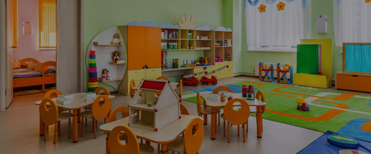 Ein hell erleuchtetes, farbenfrohes Vorschulklassenzimmer mit kleinen Tischen und Stühlen, Spielzeug, Regalen mit Büchern und Zubehör, Spielbereichen und großen Fenstern, durch die der Raum mit natürlichem Licht durchflutet wird.