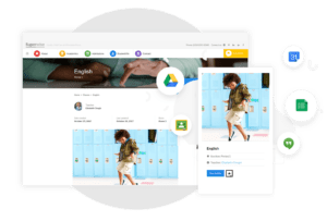 Auf einem Tablet-Bildschirm wird eine Seite des Englischunterrichts mit Lehrerinformationen und Schülerschließfächern angezeigt. Zu den umliegenden Symbolen gehören Google Drive, Google Kalender, Google Classroom und Google Hangouts.