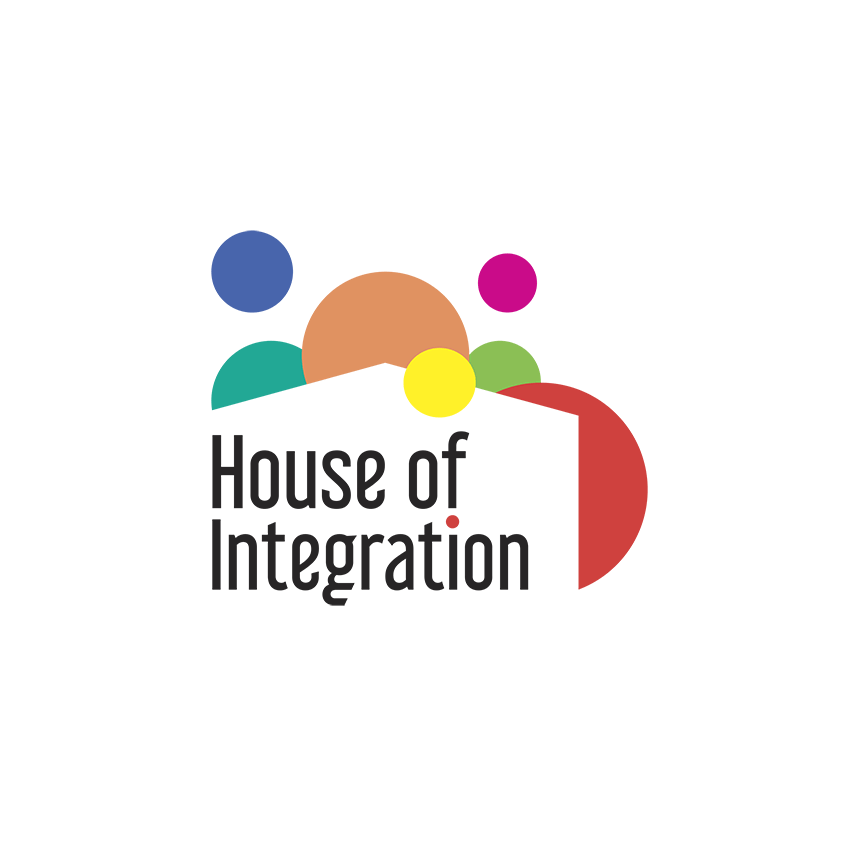 Das Logo für das House of Integration zeigt bunte, sich überlappende Kreise über und um ein weißes geometrisches Haus. Der schwarze Text „House of Integration“ steht zentriert unter den Kreisen. Der Standardhintergrund ist weiß.