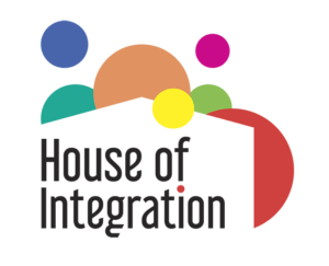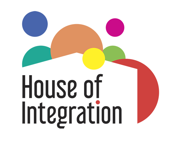 Das Logo für „House of Integration“ besteht aus fünf bunten, sich überlappenden Kreisen über und um eine dunkle geometrische Hausform, die „Zuhause“ symbolisiert, mit dem Text „House of Integration“ in fetten schwarzen Buchstaben im Inneren des Hauses.