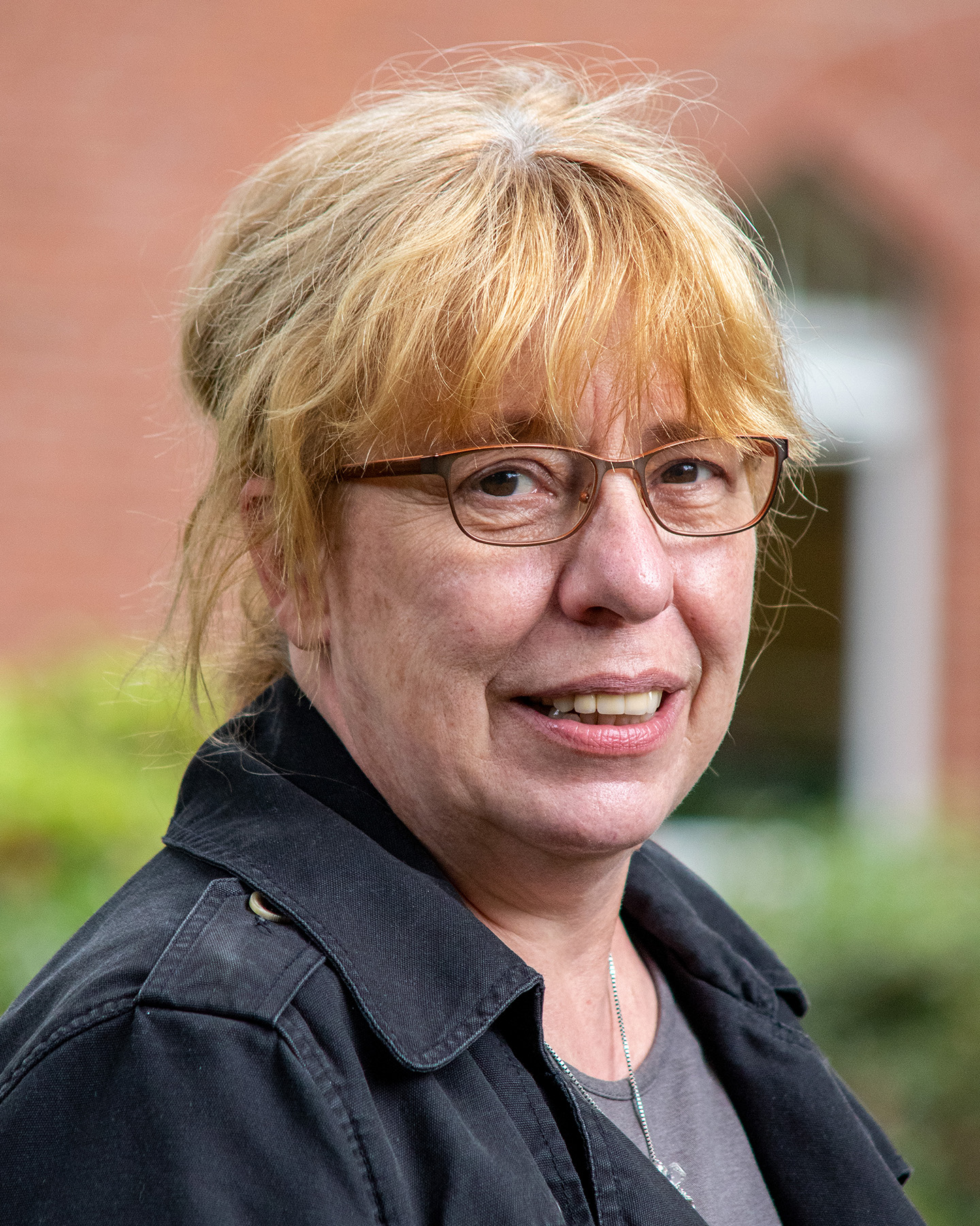 Eine Frau mittleren Alters mit blondem Haar, Brille und schwarzer Jacke lächelt leicht, während sie im Freien vor einem verschwommenen Backsteingebäude und viel Grün steht und eine warme, häusliche Standardszene einfängt.