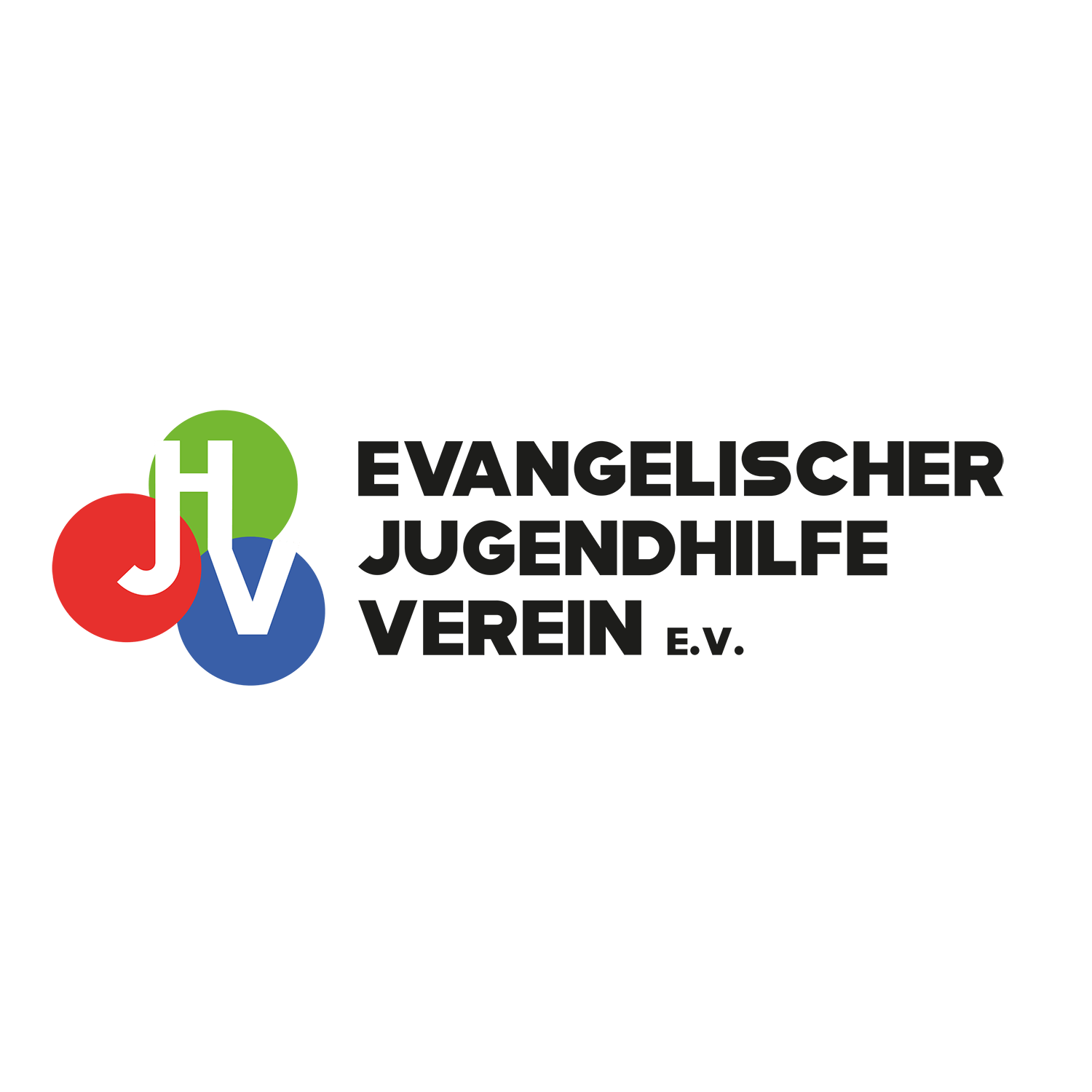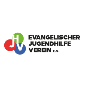 Logo des Evangelischen Jugendhilfe Vereins e.V. mit überlappenden roten, grünen und blauen Kreisen und weißen Buchstaben EJV auf der linken Seite und fettem schwarzen Text auf der rechten Seite.