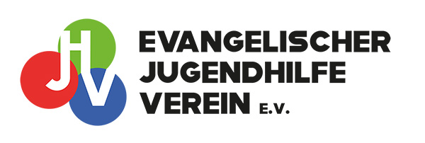 Logo des Evangelischen Jugendhilfe Vereins e.V. mit überlappenden roten, grünen und blauen Kreisen, die die Buchstaben J und V enthalten, und dem Namen der Organisation in fetter schwarzer Schrift auf der rechten Seite.