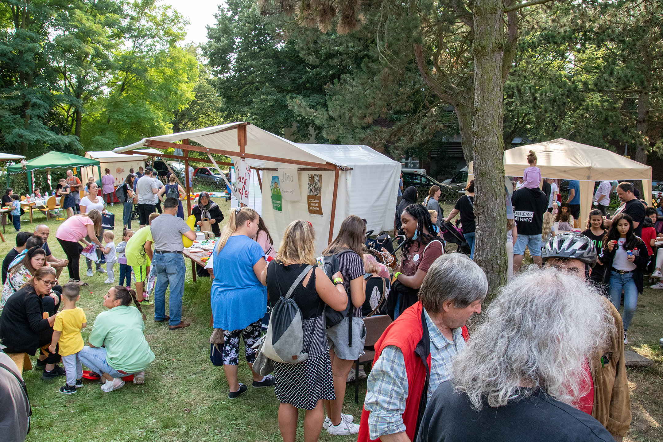 Ein lebhaftes Gemeinschaftsereignis im Freien, bei dem sich Menschen aller Altersgruppen an Marktständen und Tischen versammeln, Kontakte knüpfen und an einem sonnigen Tag unter Bäumen Aktivitäten genießen.