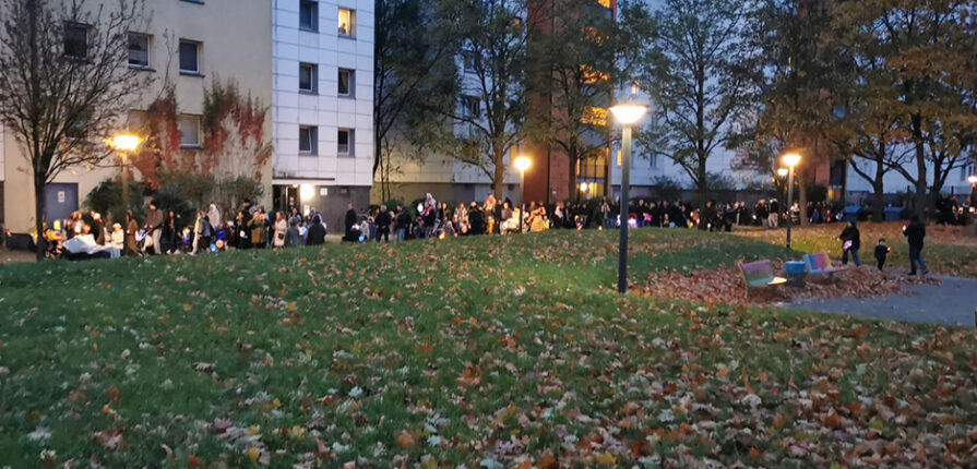 Eine große Gruppe von Menschen, viele mit Laternen in der Hand, läuft während des Laternenumzugs 2023 in einer langen Reihe durch einen grasbewachsenen Park mit Herbstlaub, umgeben von hohen Wohnhäusern und beleuchteten Straßenlaternen in der Abenddämmerung.