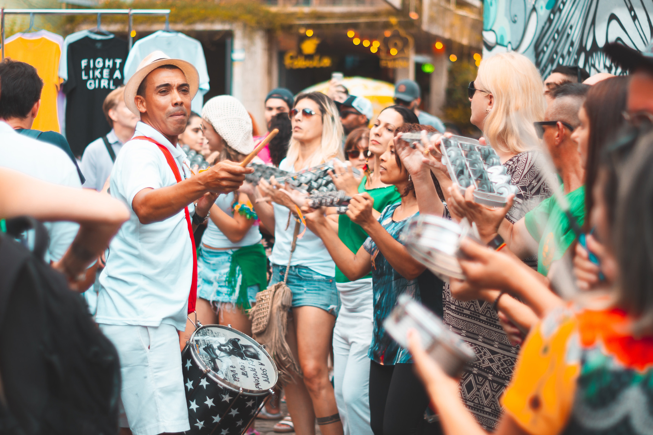 Eine lebhafte Straßenszene zeigt einen Mann in weißer Kleidung und mit Hut, der Trommel spielt, während eine Menschenmenge mitmacht, Schlaginstrumente schüttelt und bei einer festlichen Veranstaltung im Freien begeistert singt.