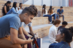 Eine Gruppe von Studierenden sitzt auf einer Ziegeltreppe im Freien und unterhält sich. Zwei Studierende im Vordergrund unterhalten sich, während andere im Hintergrund lesen, reden oder elektronische Geräte benutzen.