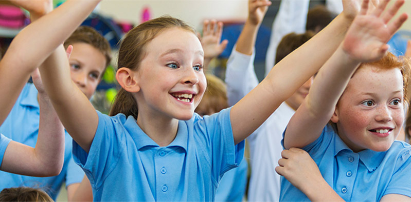 Eine Gruppe begeisterter Kinder in blauen Uniformen hebt ihre Hände und lächelt in einer lebhaften Klassenzimmeratmosphäre.