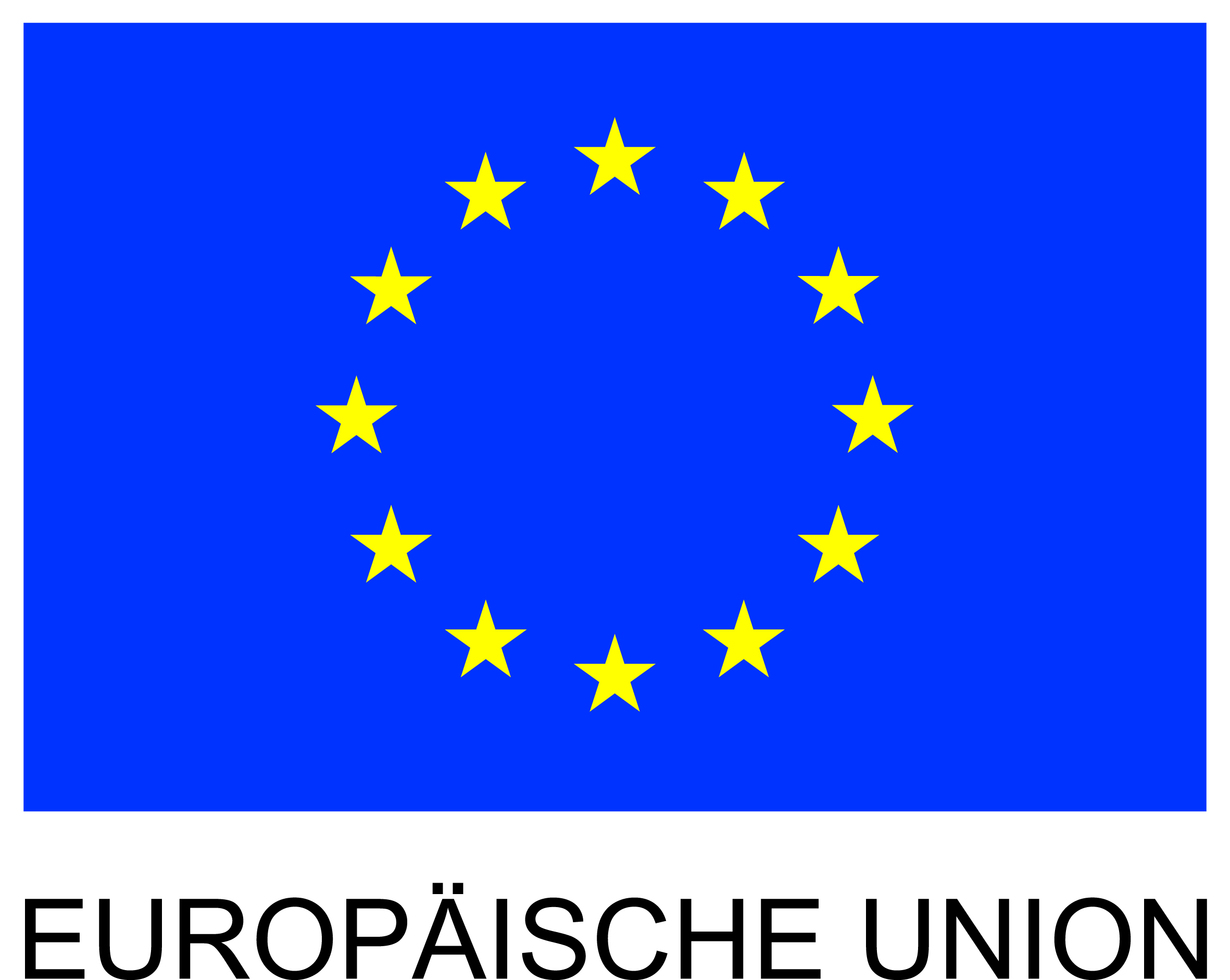 Eine blaue Flagge mit einem Kreis aus zwölf gelben Sternen in der Mitte, die die Europäische Union repräsentiert, darunter die Worte EUROPÄISCHE UNION und Hinweise auf Förderungen und Kooperationspartner in schwarzen Großbuchstaben.