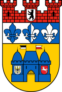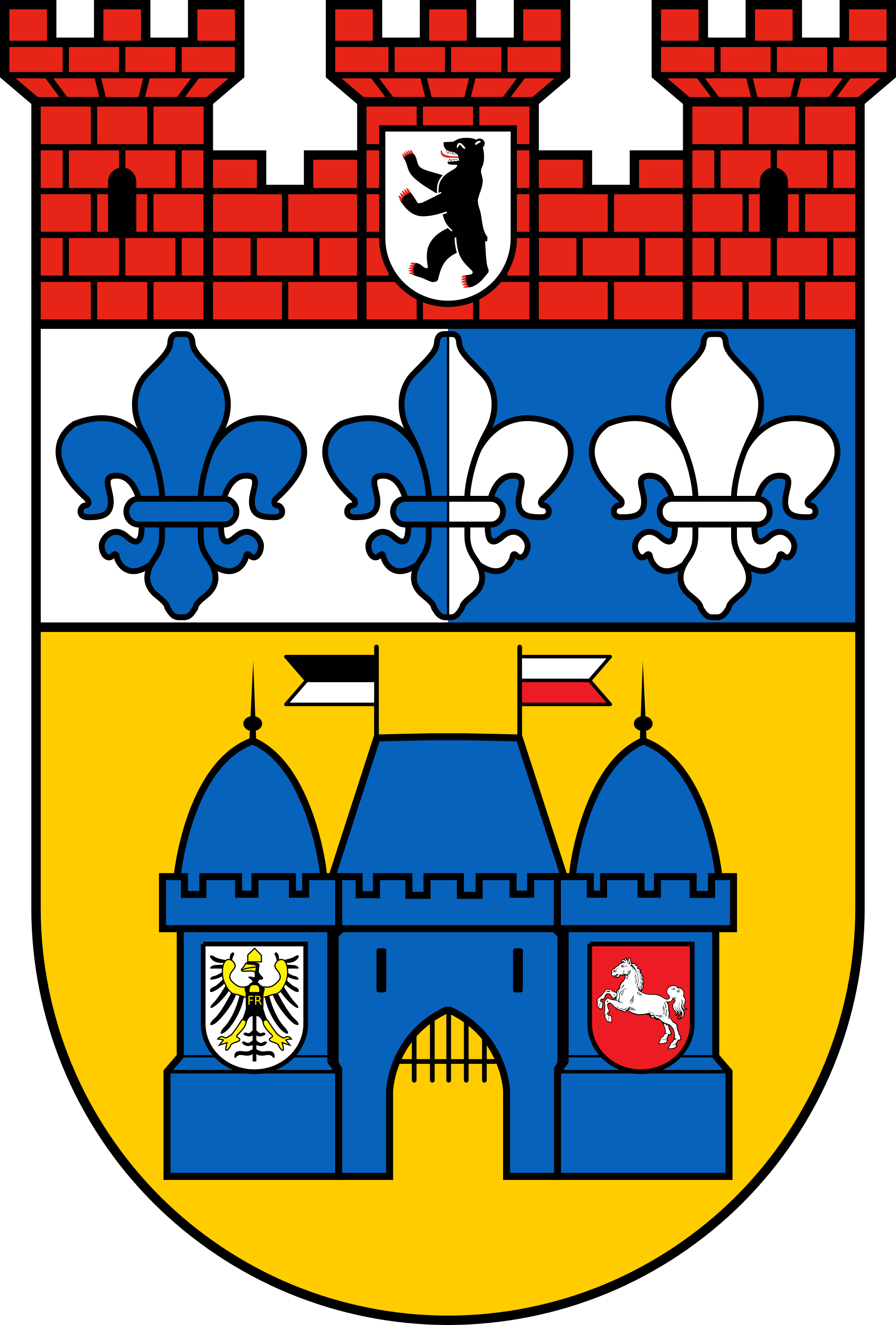 Ein Wappen mit einer roten Backsteinmauer mit einem kleinen Bärenschild, zwei blauen und einer weißen Lilie auf weiß-blauem Grund sowie einem blauen Torhaus mit zwei Schildern und Flaggen auf gelbem Grund, das starke Kooperationspartner symbolisiert.
