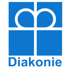 Blau-weißes Logo mit vier kreuzförmigen Quadranten und einem Herzmotiv oben, darunter steht in Blau das Wort Diakonie, das Kooperationspartner und Förderungen im sozialen Engagement symbolisiert.
