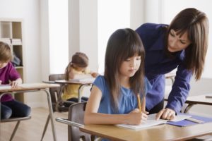 Eine Lehrerin beugt sich vor, um einem jungen Mädchen bei ihren Aufgaben an einem Schreibtisch in einem Klassenzimmer zu helfen. Andere Kinder sitzen an Schreibtischen und konzentrieren sich im Hintergrund auf ihre eigenen Aufgaben.