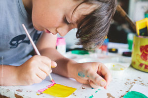 Ein kleines Kind mit braunem Haar malt mit einem Pinsel rosa Linien auf ein Blatt Papier mit einem gelben Quadrat. Die Hand des Kindes weist Farbflecken auf, im Hintergrund sind Malutensilien zu sehen.
