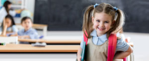 Ein lächelndes junges Mädchen mit Zöpfen und einem rosa Rucksack steht in einem Klassenzimmer und hält Bücher in der Hand, während im Hintergrund andere Kinder an Tischen sitzen.