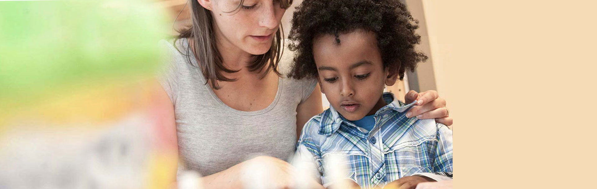 Eine erwachsene Frau hilft einem kleinen Jungen mit dunklem, lockigem Haar und kariertem Hemd, während sie gemeinsam etwas auf einem Tisch betrachten. Der Hintergrund ist leicht verschwommen.