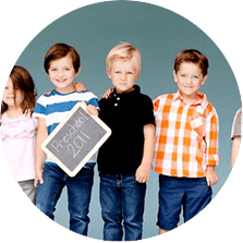 Fünf kleine Kinder stehen lächelnd in einer Reihe. Ein Junge hält ein kleines Kreideschild mit der Aufschrift „Vorschule 201“ in weißer Kreide. Sie tragen Freizeitkleidung und stehen vor einem schlichten blauen Hintergrund.