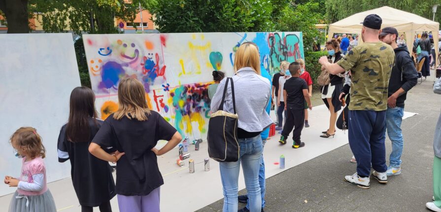 Spray, Spray, Hooray! Am Freitag fand in unserem BusStop Familienzentrum der zweite Sprayer Workshop statt – ein voller Erfolg! Unter der Anleitung des Graffiti-Künstlers SONE entwarfen junge Erwachsene ein Motiv zur künstlerischen Neugestaltung der Fassade eines HOWOGE-Wohngebäudes in der Thermometersiedlung.