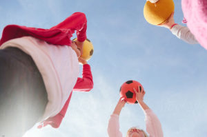 Kinder stehen im Kreis und blicken in den Himmel. Sie halten bunte Bälle – zwei gelbe und einen rot-schwarzen – und tragen lässige, farbenfrohe Kleidung. Das Bild fängt einen spielerischen Moment des Studentenlebens aus niedriger Perspektive mit einem klaren, blauen Himmel darüber ein.