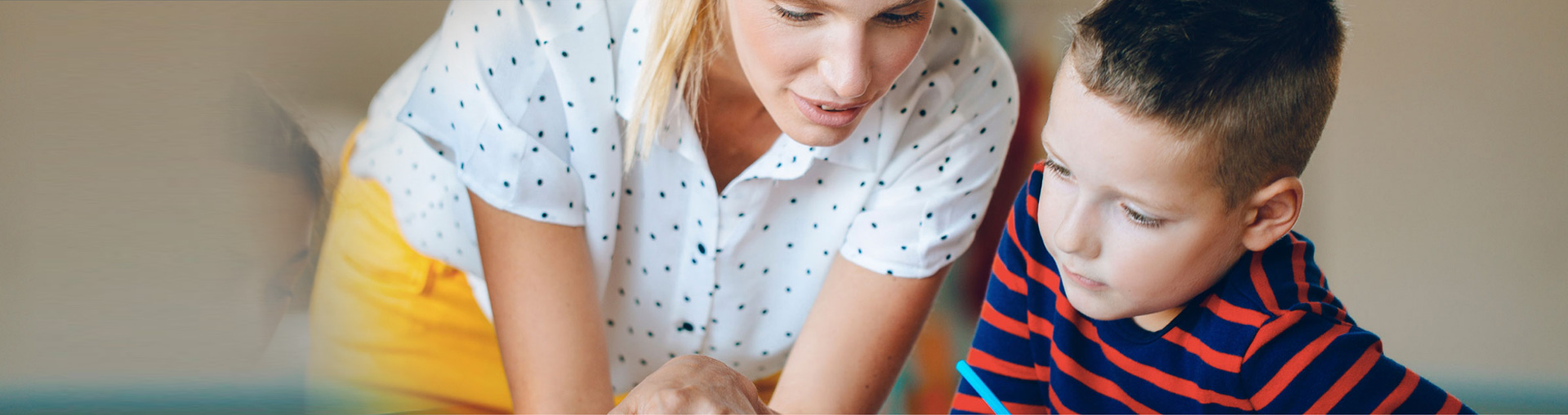 Eine Frau und ein kleiner Junge sitzen eng beieinander und betrachten etwas vor ihnen. Die Frau trägt ein weiß gepunktetes Hemd, der Junge ein dunkelblau-rot gestreiftes. Beide wirken konzentriert und aufmerksam.